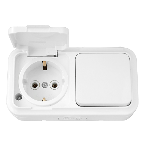 Блок (1 выкл. + роз с з/к) ОУ IP54, серия ПРАЛЕСКА АКВА, белый (В-РЦ-657)